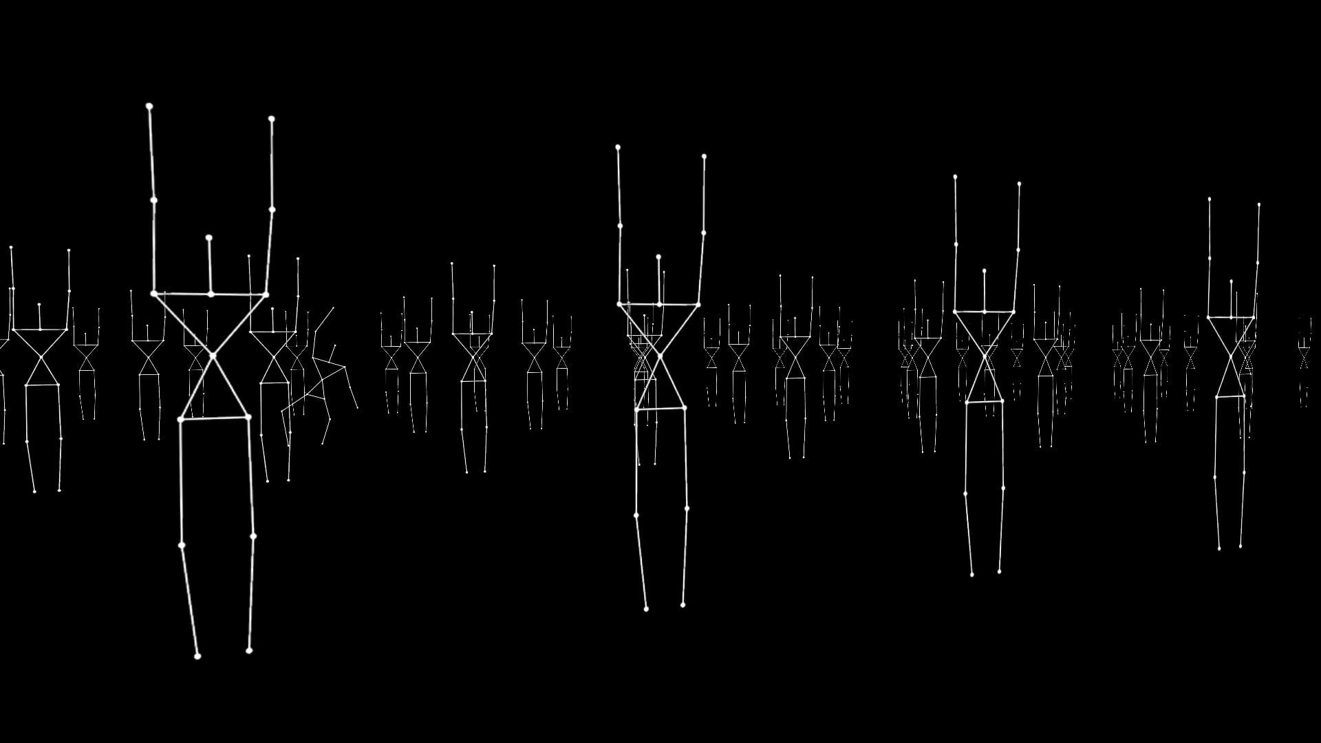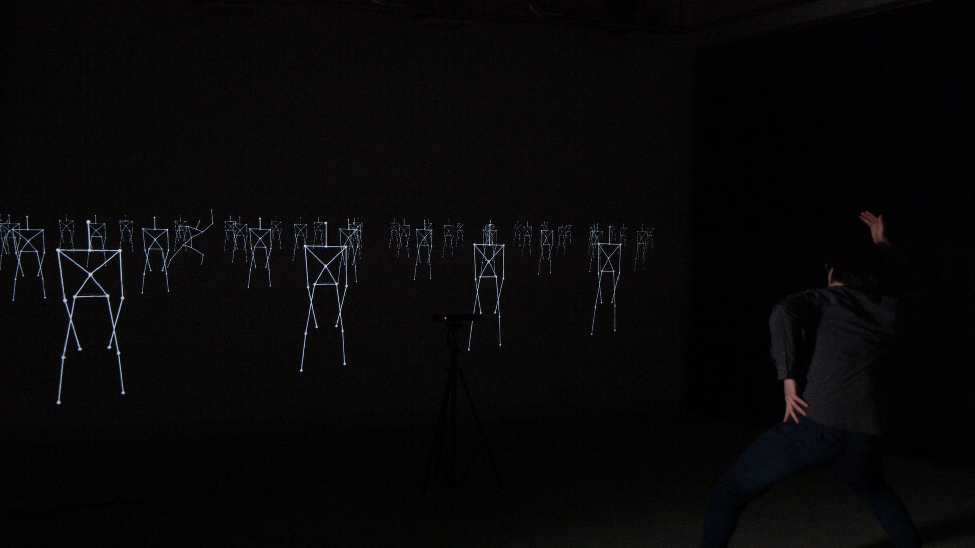 モニターの前に立った観客の身体は、深度センサーの骨格検知により映像の中で統一された規格である棒人間に変換され、その群集の一人として紛れ込む。一見するとよくは分からないが、体を動かしてみると自分の動きと同期した棒人間が一人だけいる。いわば、映像の中に自分を発見する作品である。
